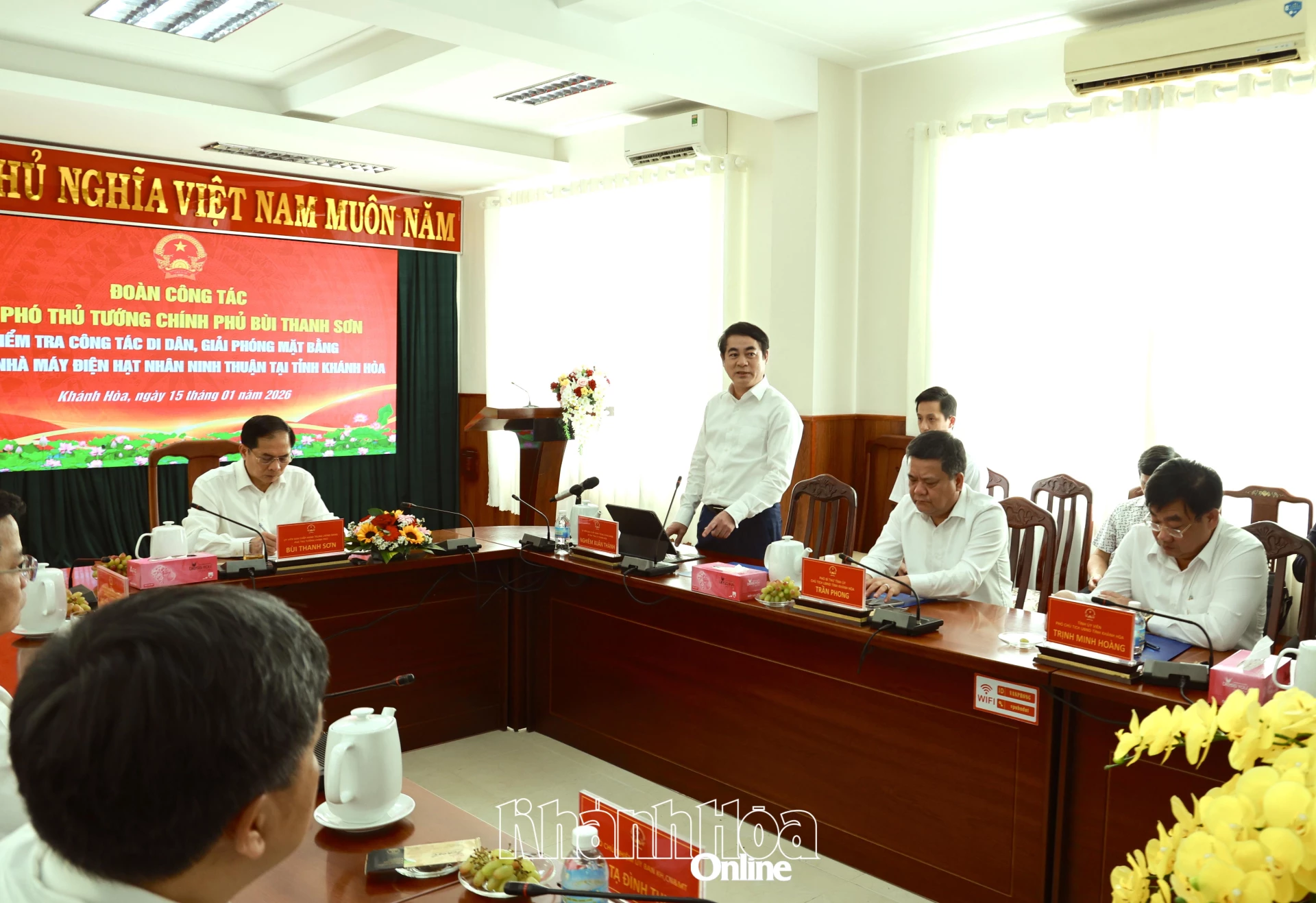 Sáng 15-1, Đoàn công tác của Chính phủ do đồng chí Bùi Thanh Sơn – Ủy viên Trung ương Đảng, Phó Thủ tướng Chính phủ làm Trưởng đoàn có buổi làm việc với tỉnh Khánh Hòa về tình hình triển khai Dự án Nhà máy Điện hạt nhân Ninh Thuận 1 và 2. Tham gia đoàn công tác có đồng chí Nguyễn Thanh Hải – Ủy viên Trung ương Đảng, Ủy viên Ủy ban Thường vụ Quốc hội, Chủ nhiệm Ủy ban Khoa học, Công nghệ và Môi trường; lãnh đạo các bộ, ngành Trung ương. Về phía tỉnh Khánh Hòa có các đồng chí: Nghiêm Xuân Thành – Ủy viên Trung ương Đảng, Bí thư Tỉnh ủy; Trần Phong – Phó Bí thư Tỉnh ủy, Chủ tịch UBND tỉnh; Trịnh Minh Hoàng – Phó Chủ tịch UBND tỉnh, cùng lãnh đạo các sở, ngành, địa phương liên quan.